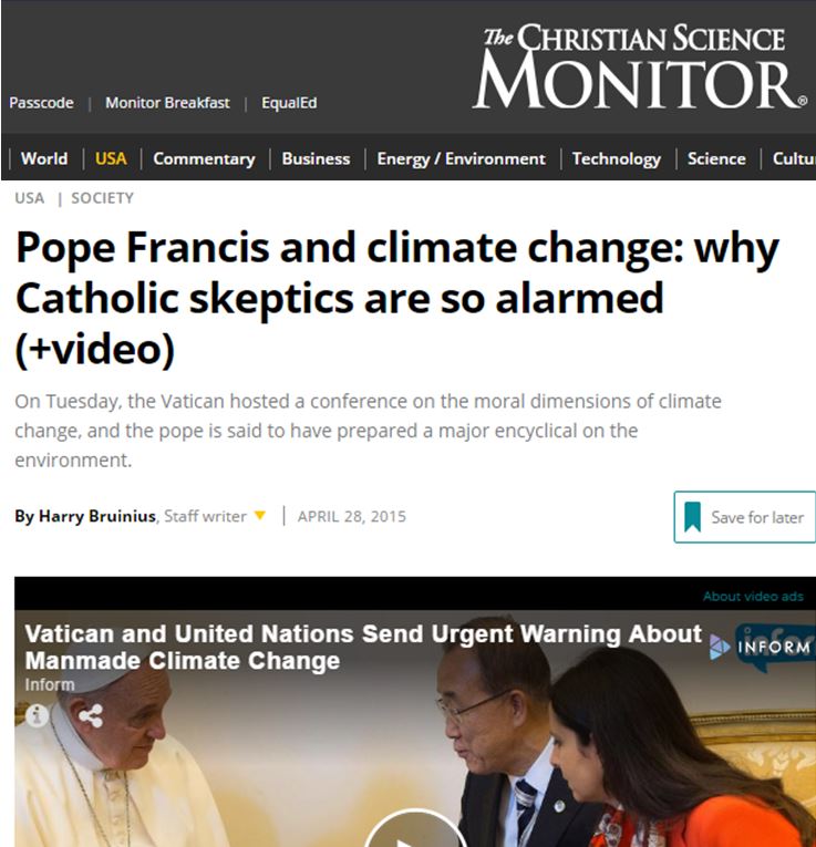 O Papa já preparou uma importante encíclica - ou guia moral para os 1,2 mil milhões de católicos - que, no final deste ano, enfatizará o imperativo de abordar o aquecimento global causado pelo homem. E na terça-feira, a Academia Pontifícia das Ciências e outras organizações organizaram uma cimeira no Vaticano chamada "Proteger a Terra, Dignificar a Humanidade: As Dimensões Morais da Mudança Climática e Desenvolvimento Sustentável", considerada uma reunião para ajudar a fortalecer o "Consenso Global" sobre a questão.